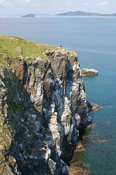 Высокие обрывистые скалы. На заднем плане острова Попова и Козлова.