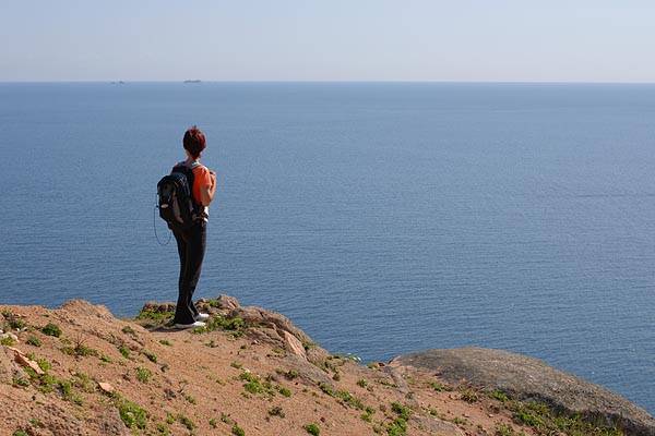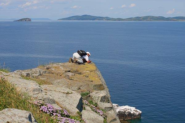 На самом краю очень высокого обрыва. На заднем плане острова Попова и Козлова.